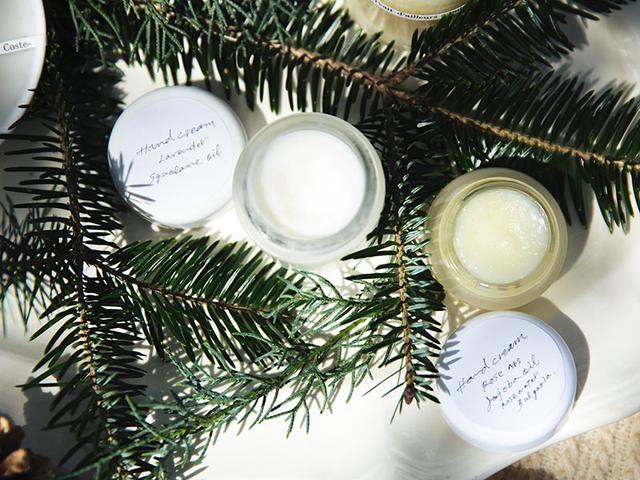 *クリームがかたすぎるようであれば、キャリアオイルを加えて再び湯せんにかけ、好みの粘度にする。やわらかすぎるなら、みつろうを足して同様に湯せんにかける。熱を加えるとエッセンシャルオイルは蒸発するので、再度、エッセンシャルオイルを加えること。