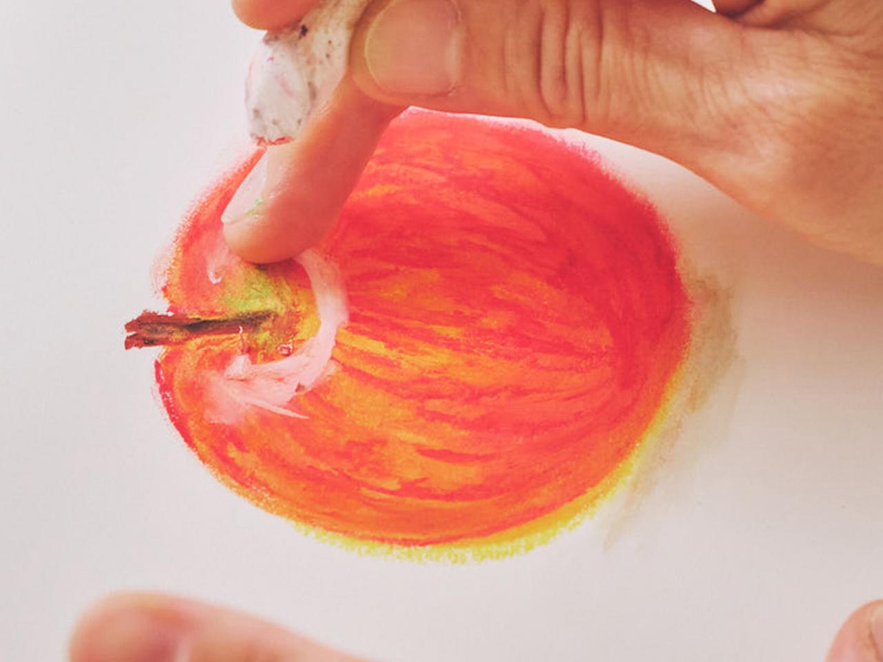 川崎さん:ハイライトを入れると、さらにそれっぽくなりますよ。光が当たっていると思う部分を白いクレヨンで塗り、指で軽くぼかしたら、りんごのスケッチの完成です!