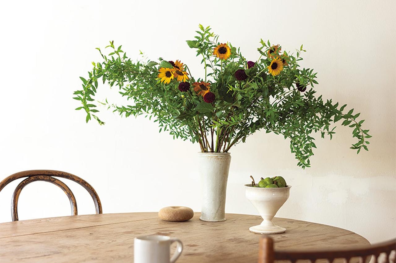 親しい人が集う食卓。大ぶりな花をしつらえるときは、私は壁につけて飾ることが多いのです。その姿はまるで、首をかしげてみんなを見守るかのよう。