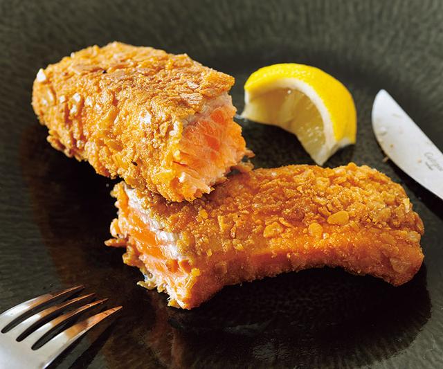 2 キッチンペーパーで1の水けを押さえ、薄力粉を茶こしなどで全体にまぶす。溶き卵にくぐらせ、クラッカーの衣を付けて、170℃に熱した米油で揚げる(生食用のサーモンなら2~3分、加熱用は3~4分)。器に盛り、くし切りにしたレモン(分量外)を添える。