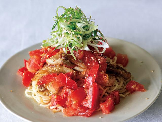 • キャベツやトマト、豆腐まで、食材がちょっと余ると、すぐに塩もみをして保存するというワタナベマキさん。かさが減るぶん、たっぷり食べられるだけでなく、料理に使う際に、おいしいだしになってくれるそう。塩で下処理をしたあとの活用レシピを教えていただきました。今回は『塩トマトとカリカリ豚のあえ麵』です。