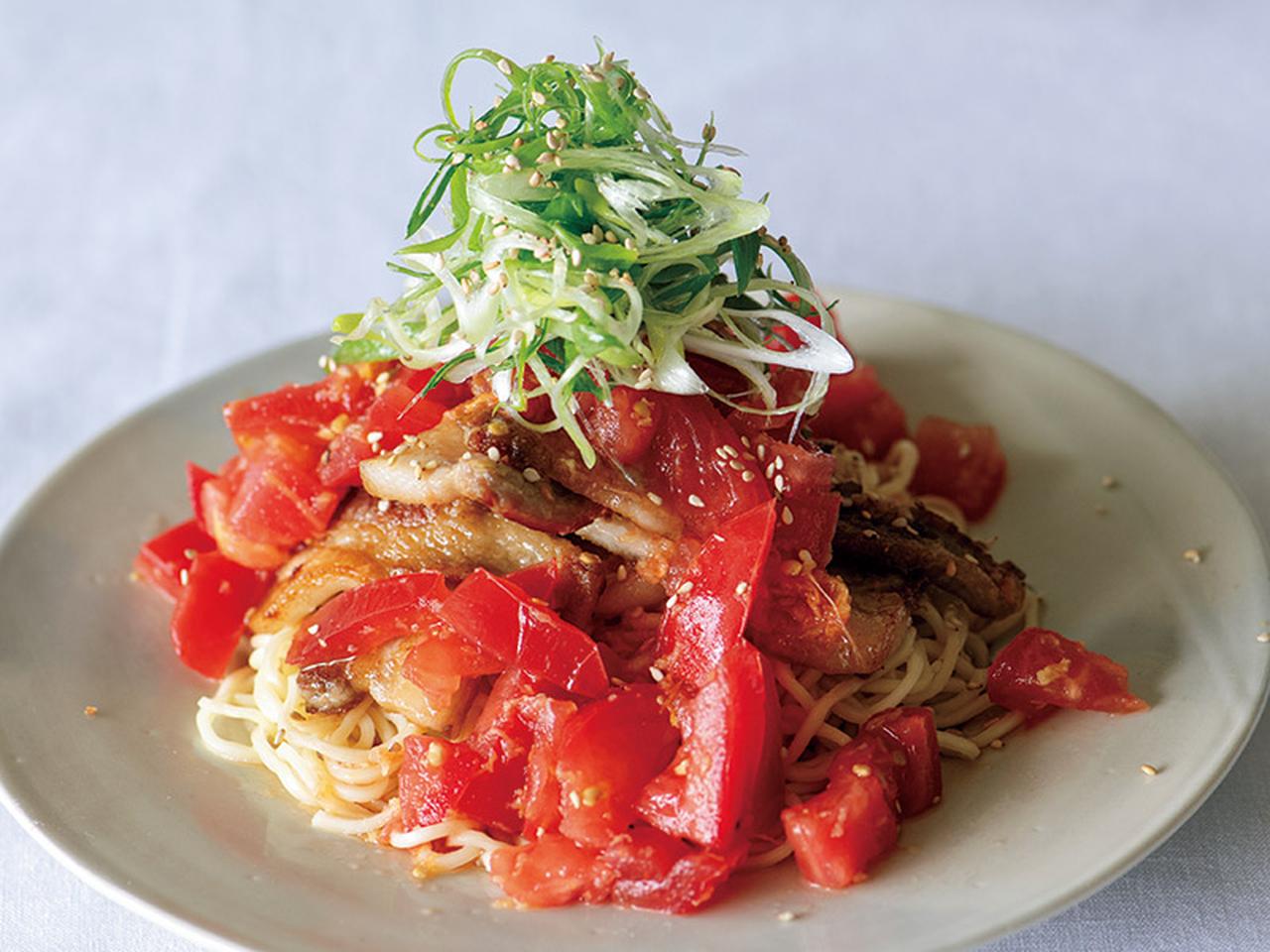 塩トマトに、しょうがのすりおろしと酢を加えトマトだれに。豚バラ肉は、脂を十分出しきってカリカリに炒めるのがコツ。