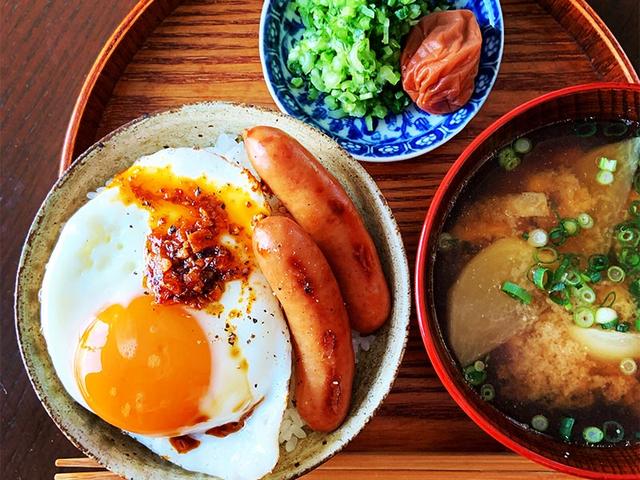 3 器にごはんを盛り、目玉焼きとソーセージをのせ、しょうゆ(または塩)少々と食べるラー油をかける。粗びき黒こしょう少々をふっていただく。