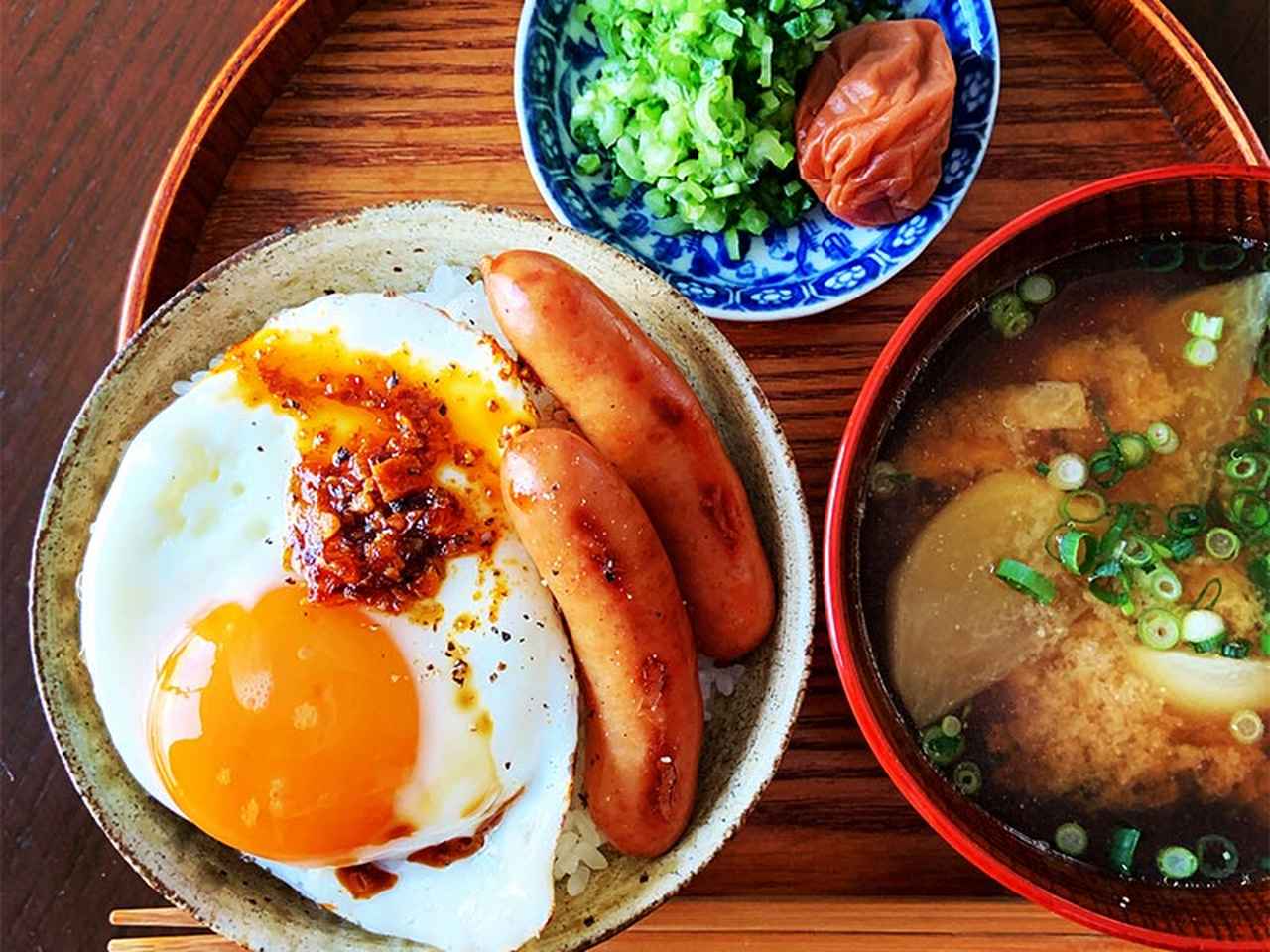 ソーセージはパリッとゆで焼きに、目玉焼きは白身が固まる前に火を止め、ごはんになじむ柔らかさに。食べるラー油がポイントですが、しょうゆと塩はお好みのほうを。