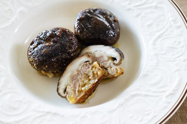 2 ボウルにしいたけの石づき、豚ひき肉、しょうが、にんにく、ねぎを入れて混ぜ、卵を少しずつ量を加減しながら加え、全体がまとまるまでよく混ぜて塩、こしょうをふる。