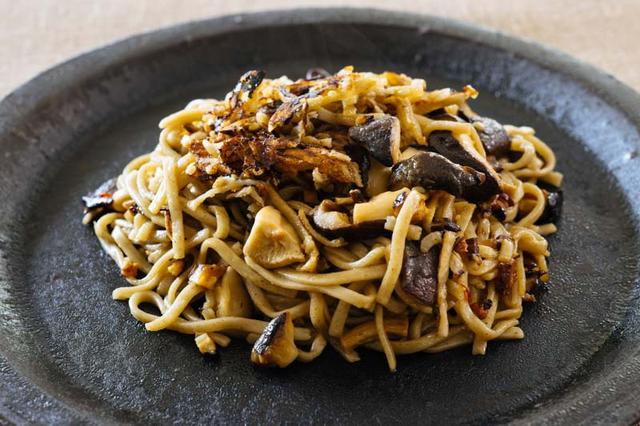 2 中華鍋を熱し、ごま油、干ししいたけ、赤とうがらしを入れて炒める。生どんこしいたけの傘と石づきを入れ炒め、塩、こしょうをふる。ごま油を加え、ゆでたそばを加え弱火でゆっくり炒める。途中そばがくっつきそうになったら酒を入れる。