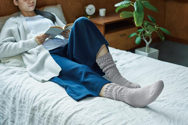 「起毛であったかルームソックス」は、サーモスの魔法びんの保温効果から着想を得て開発されたもの。靴下の内側部分に独自開発の「極起毛」が採用され、その毛足の長い「極起毛」が空気層をつくることで、足先の体温をキャッチして保温します。