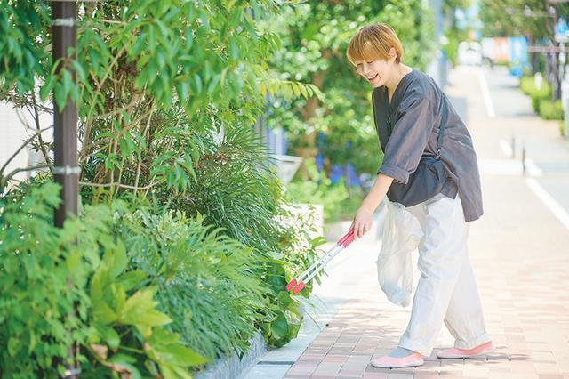マイトングとごみ袋持参で、家の周りの道路のごみを拾います。5分もするとごみ袋はパンパン。「道にごみを捨てるなんて!」と最初はイライラしていたけれど、どんどんきれいになっていく様子に晴れ晴れとした気持ちになったのだそう。「小学生の女の子にお礼をいわれたり、地域の方との交流が生まれたり、世界が広がりました」