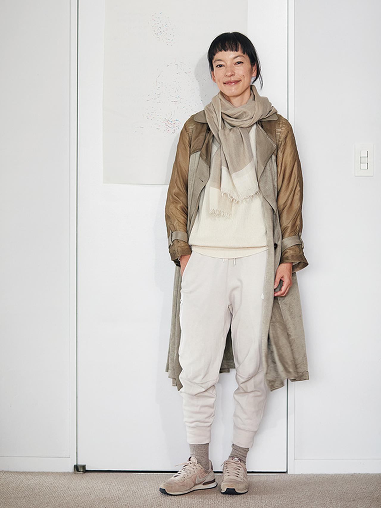 袖に透け感がある個性的な「エタブルオブメニーオーダーズ」のコートに「オーシバル」のニットと「ナイキ」のスウェットパンツを合わせた同系色コーディネート。ベージュのスニーカーも「ナイキ」。