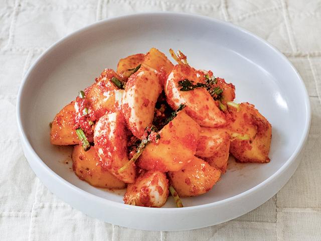 画像: まるで浅漬けのように、さっと漬けてあえるだけのキムチ。柿は熟しすぎない、食感が残るものを使います。
