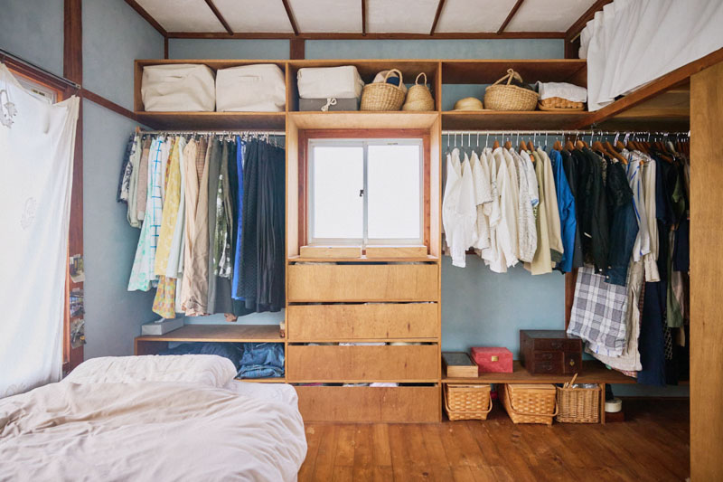 押入れの襖は取り外し、ほとんどの洋服を吊るして収納できる仕様に。アウターやワンピース、シャツなどは用途別・色別にゆるやかに並べられ、ひと目でどんな服があるのか把握しやすくなっています。