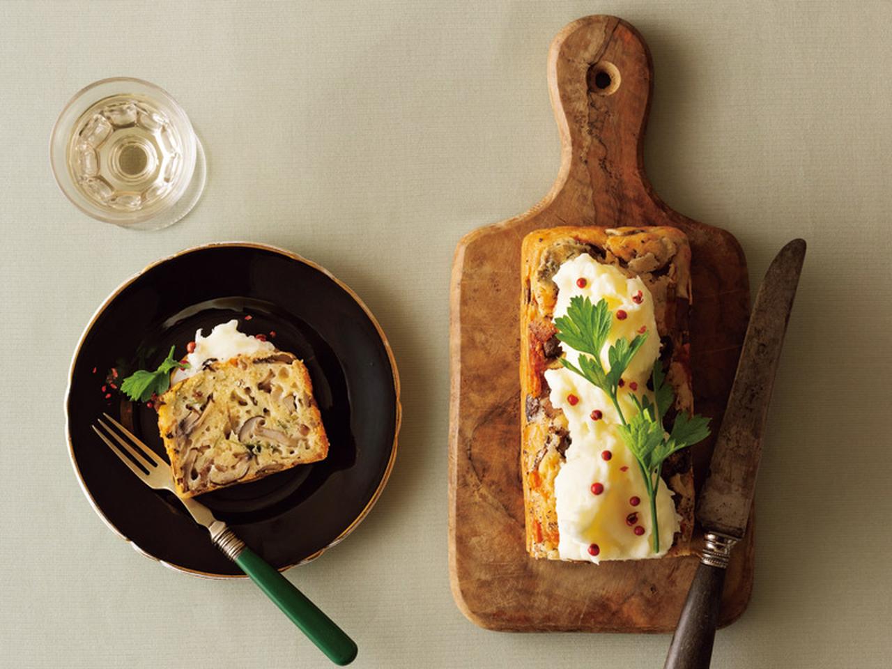炒めた際に出るきのこのエキスも閉じ込めたうま味たっぷりの塩味ケーキ。