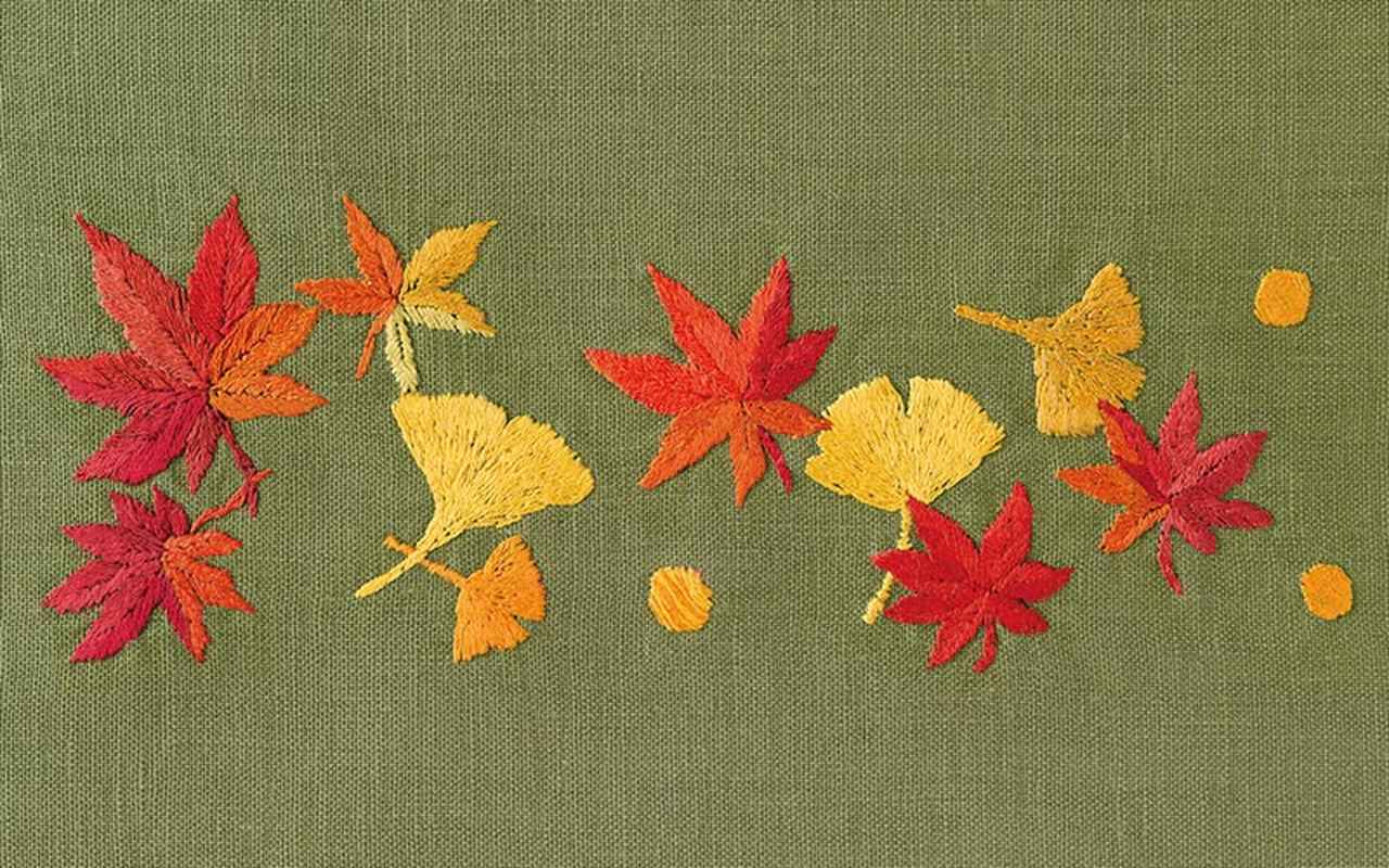 今回の作品では、モミジの葉は同系色を3~4色組み合わせてグラデーションにし、イチョウの葉は2色を1本ずつとって刺しゅうしています。