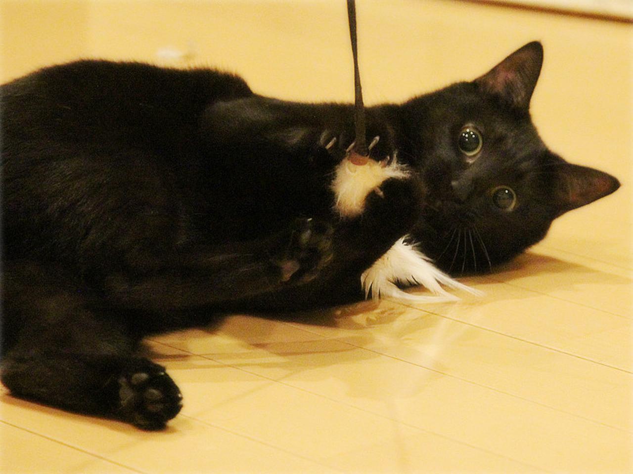 おもちゃをただやみくもに振るのではなく、生き物のような動きを。しばらく床にじっとさせたまま、猫たちが飛びついてきた瞬間に鳥が羽ばたく感じで動かしたりと変化をつけます。