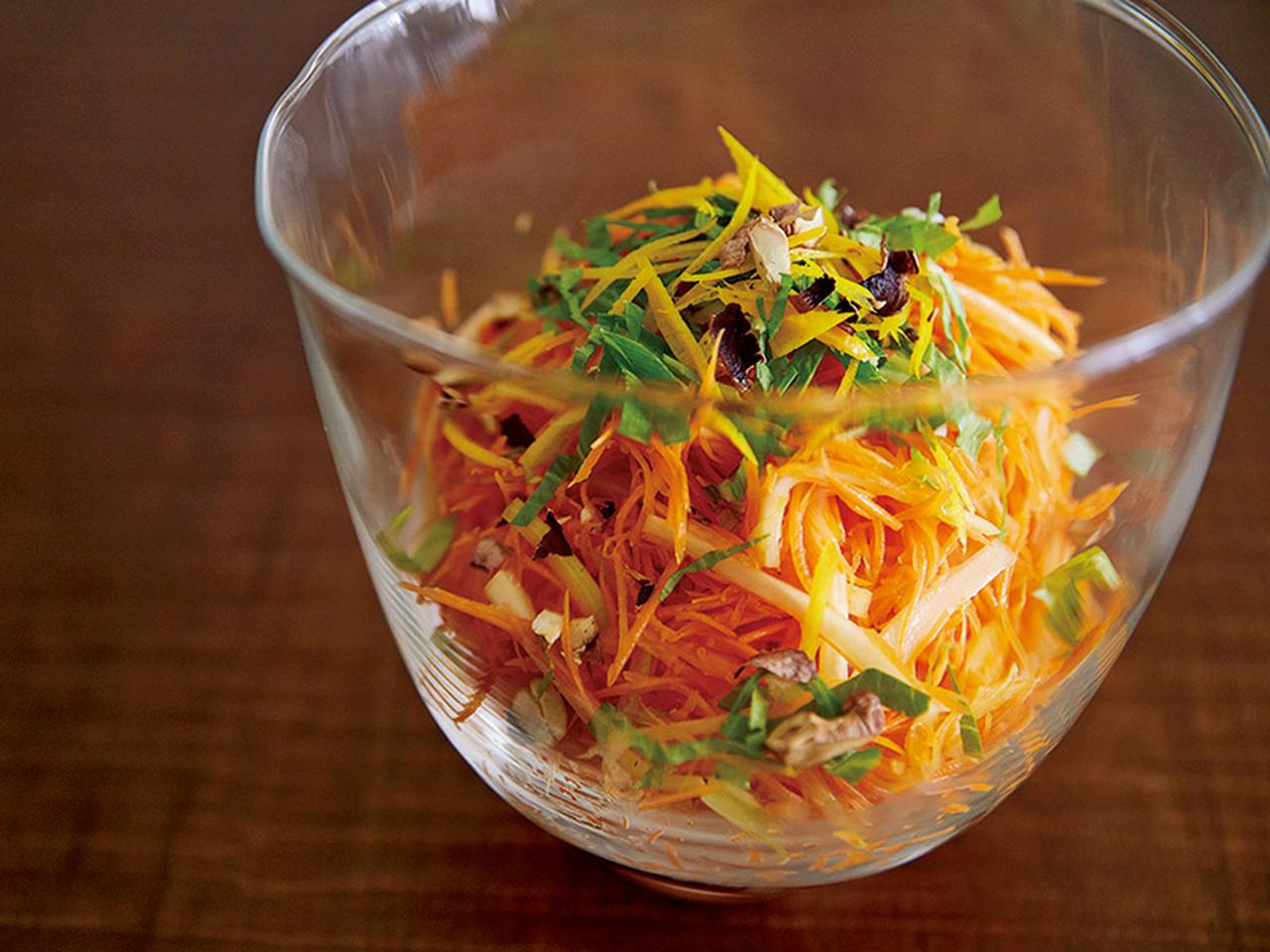 定番のラぺは、オレンジの風味と香り、ナッツなどを組み合わせて。前の晩に仕込んで冷蔵庫に入れておくと、より味がしみておいしい。