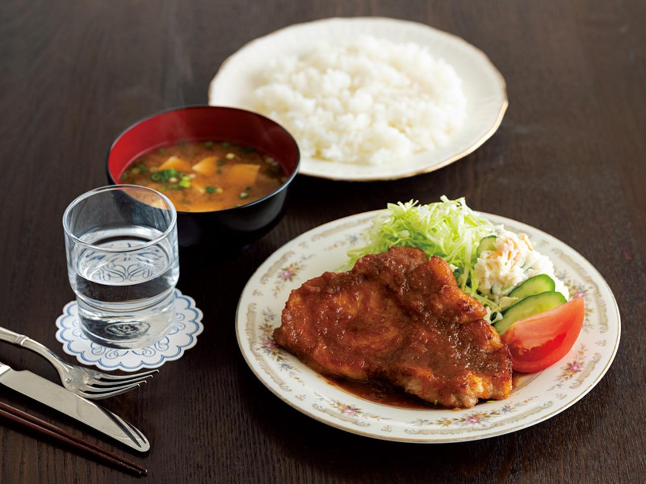 3 余分な油を吸い取り(こげはうま味なのでふきとらないように)、Aを加えて中火にかける。煮立たせてから1分ほど煮詰め、2を戻し入れる。煮汁をまわしかけながら2分ほど煮たら火を止め、バターを加えてさっと混ぜる。器に盛り、キャベツのせん切り、くし形切りにしたトマト、きゅうりのスライス、ポテトサラダを添える。