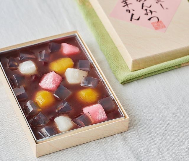 寒天や求肥、栗を宝石のようにちりばめ、みずみずしい羊かんとあんみつの味わいをひとつにした贅沢な和菓子。