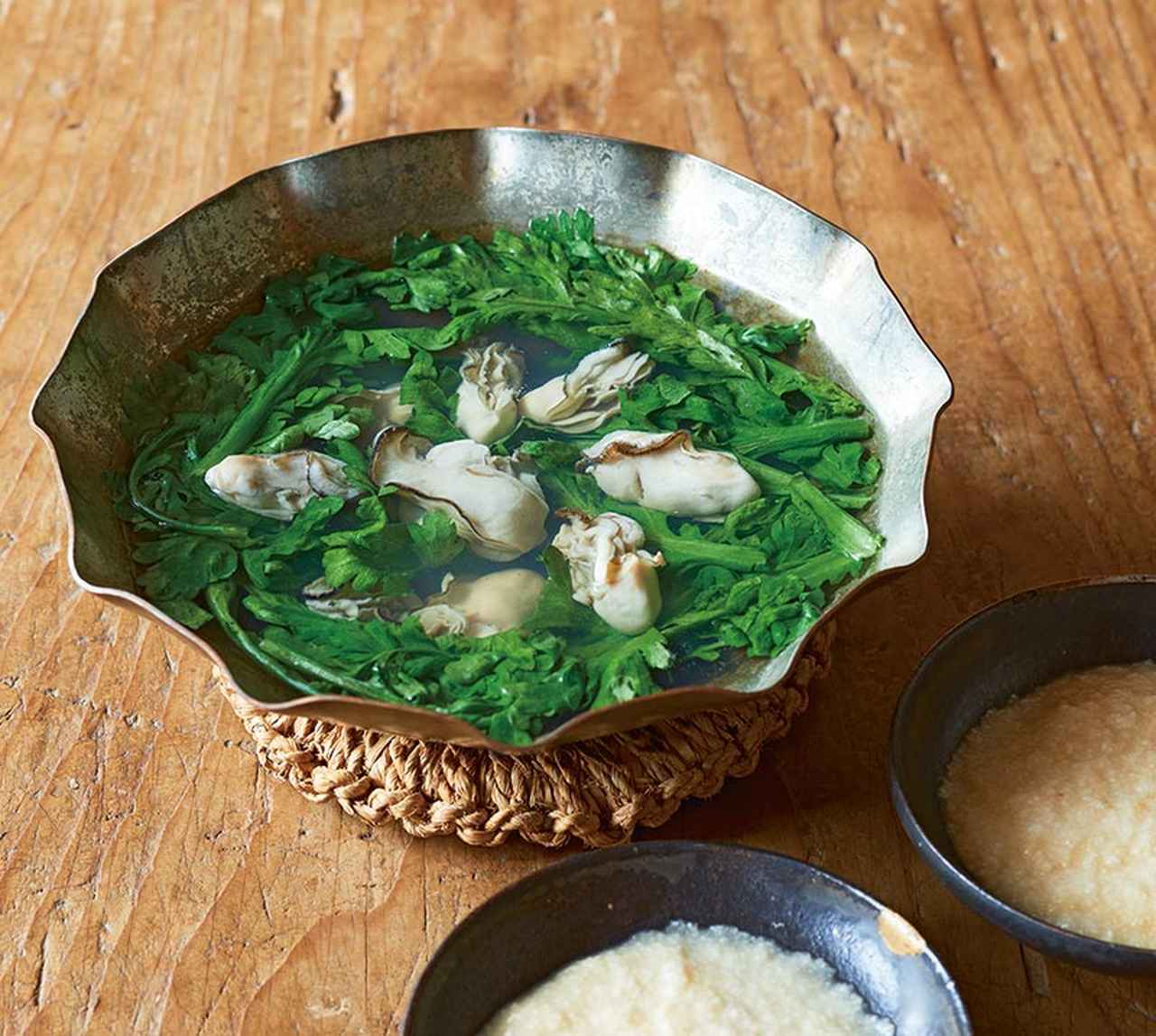 あれこれ具材を入れるより青菜だけのほうが、かきのうま味が引き立ちます。とくに春菊は、独特の香りがかきの風味と好相性。