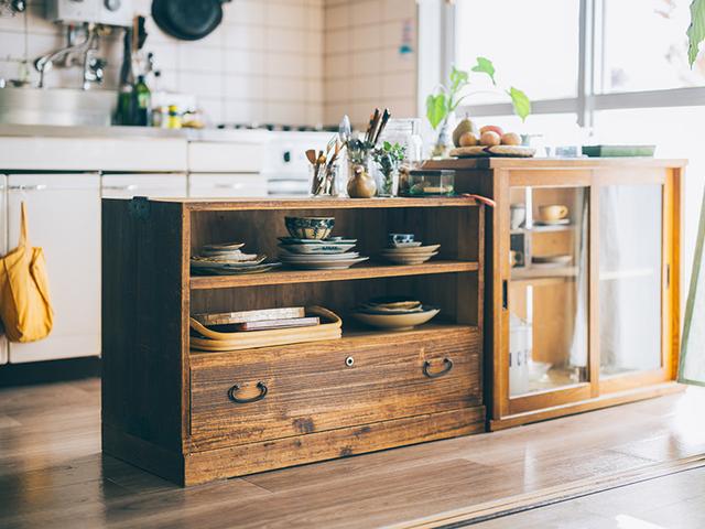 父がメンテナンスしてくれた桐箪笥(左)と母から譲り受けたガラス窓の棚(右)