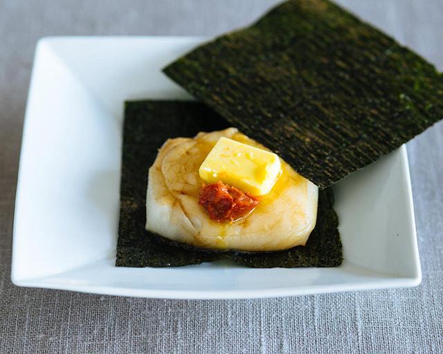 卵黄としょうゆをよく混ぜ、パリッとしたのりでお餅を巻くだけ。