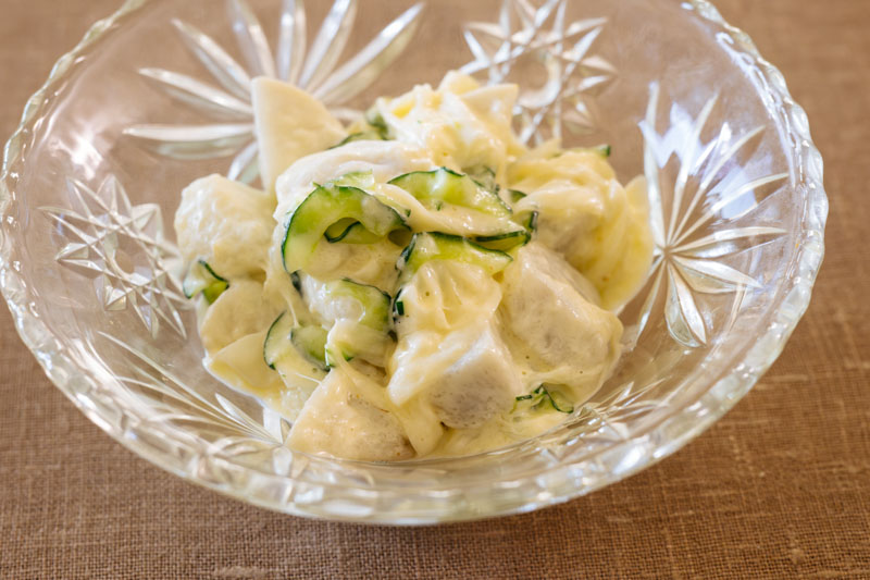 6 5に粗熱を取った4の里いも、水けを絞った3のきゅうりを入れて、味をみて、塩と白こしょうでととのえる。