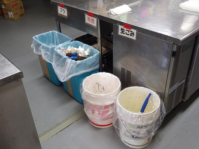 調理で出たごみは厨房内の残渣分別用のごみ箱に