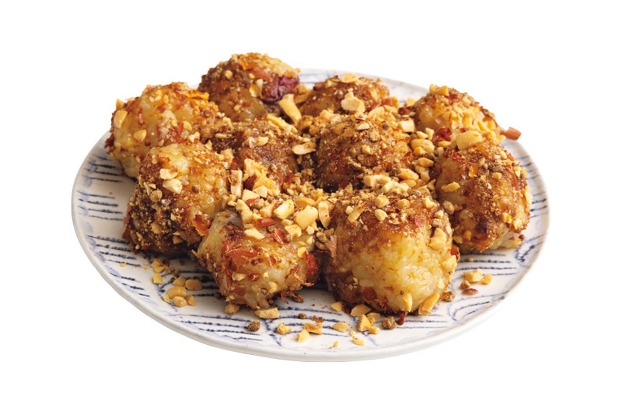 3 炊き上がったらめん棒でついてさつまいもをつぶしながら全体になじませ、12個分に分けて丸め、バットに並べる。