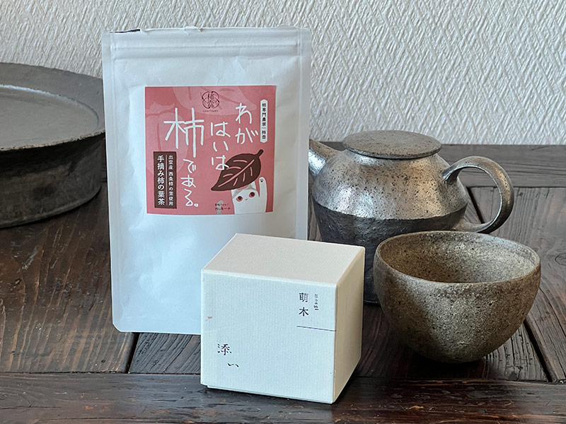 「お煎茶もいただきますが、出雲から母娘でいらっしゃる生徒さんからいただいて気に入っているのが柿の葉茶。出雲の柿の葉をつかった、ほんのり甘みと酸味があって飲みやすいお茶です」