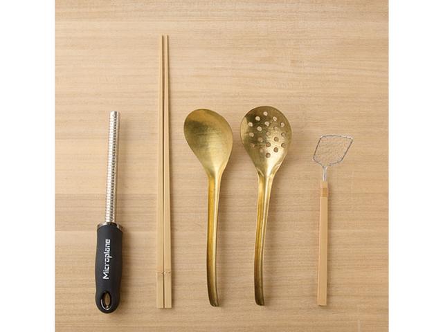 左から)「マイクロプレイン」のゼスターグレーター。先の細い竹製の盛り付け箸。「有次」の真鍮製レードルと穴あきレードル。ステンレス×竹の豆腐すくい