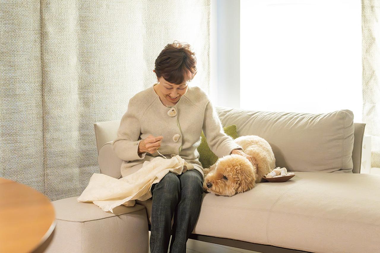 画像: ソファが松田さんの針仕事の定位置。好きな音楽をかけて、針箱など仕事道具を横に置いて準備万端。愛犬のググがいつも寄り添う