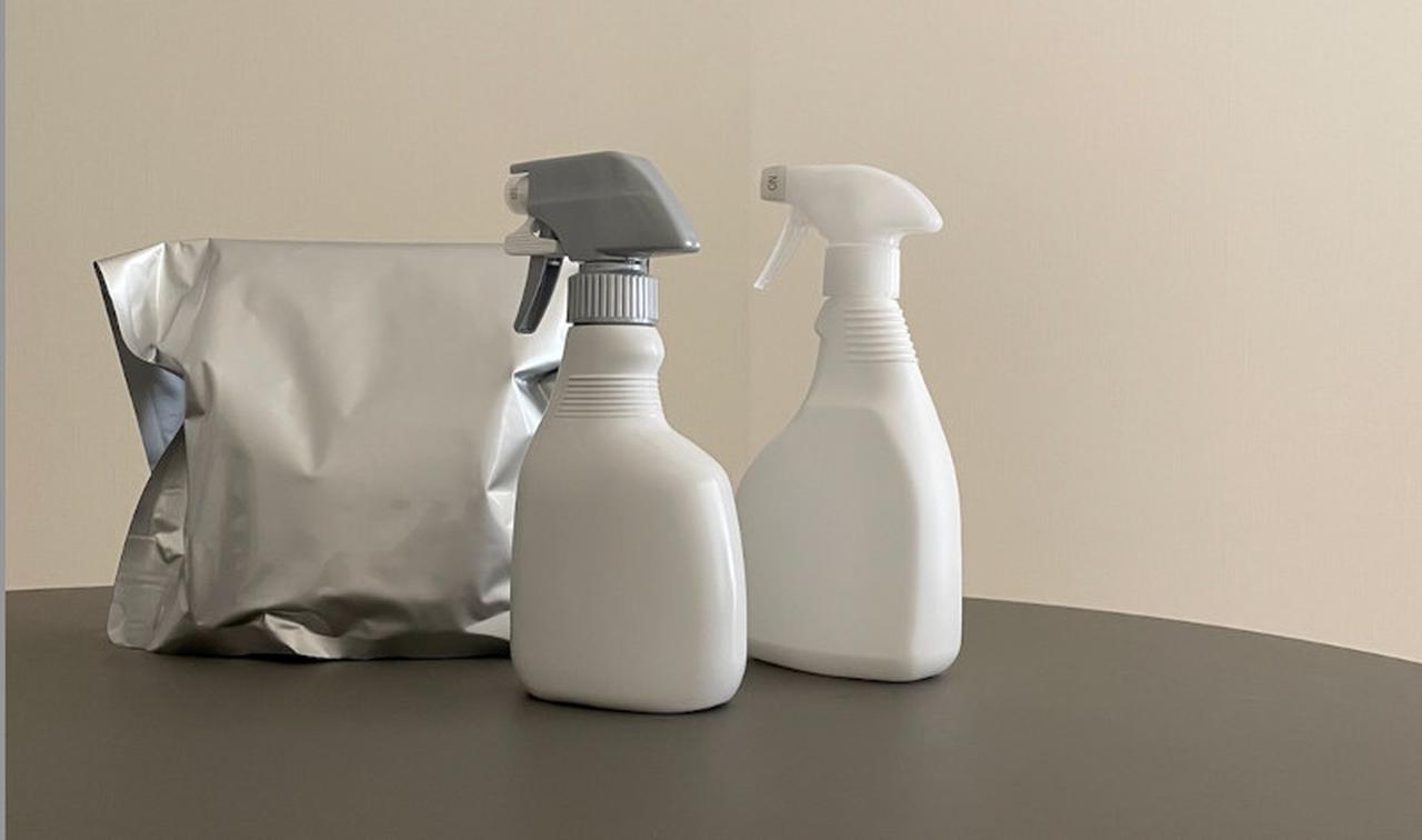 画像: 洗剤等のラベルははがして。キッチン、バスルーム、トイレは緑の魔女シリーズ。アルミ袋のなかは多目的洗浄剤花子。20年愛用