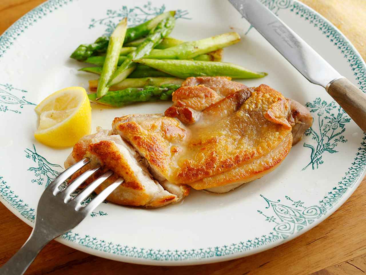 上下を返して中火にし、空いている場所にアスパラガスを加えて炒める。鶏肉は3~4分火を通す(出てきた脂はペーパータオルで拭く)。器に盛り、レモンを添えて食べるときに絞る。