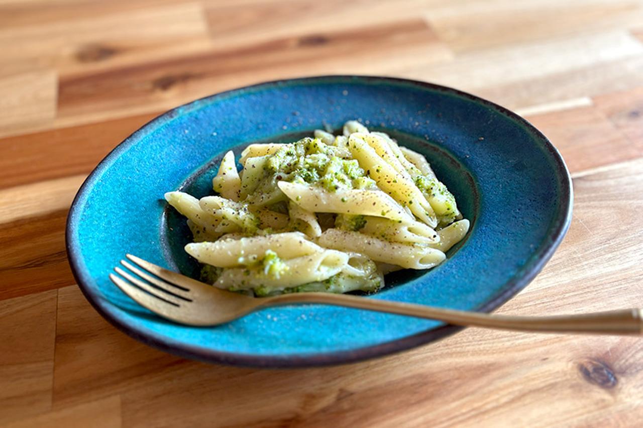 春先にかけて旬を迎えるブロッコリーを茎ごと使い、パスタと一緒にクタクタに煮て、具材兼ソースのとろみづけとして活用します。