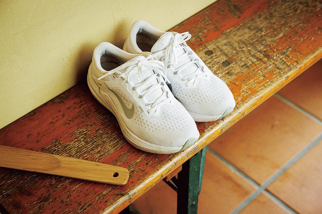 安曇野暮らしで欠かせないのが歩きやすいスニーカー。今年の春の装いに選んだのは「ナイキ」の白。