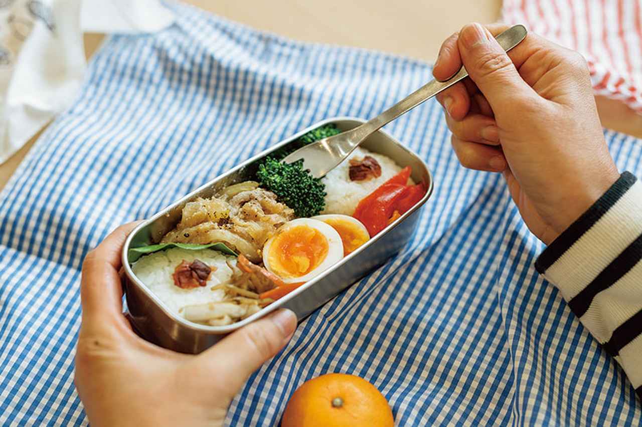 「同居の母がつくってくれるおかずに野菜の副菜を足して詰めています」と江角さん。貝割れ菜入りの厚焼き玉子は大好物の定番メニュー