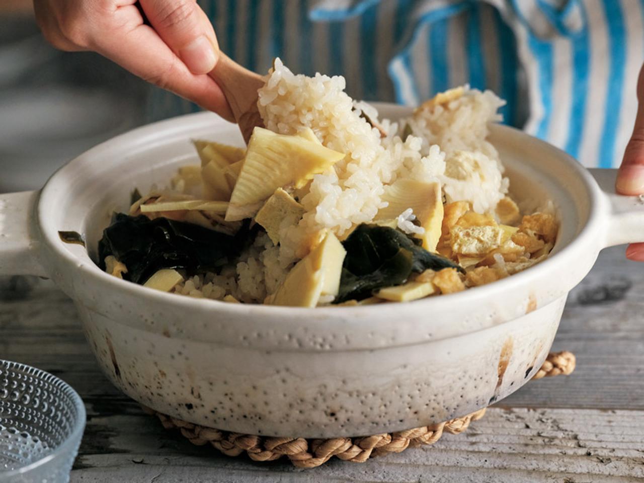 土鍋にを入れ、分量の水を注いでAを加えて軽く混ぜ、準備したたけのこの水煮、わかめ、油揚げをのせる。ふたをして中火にかけ、沸騰したら弱火にして12分加熱する。火を止め、10分ほど蒸らす。
