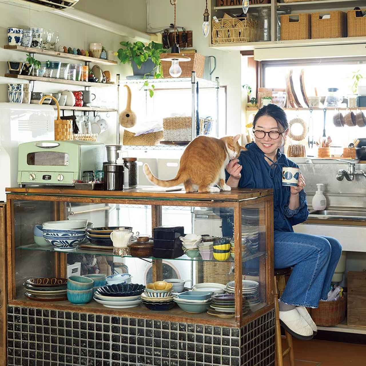 食器棚として使っている古道具は、たばこ店のショーケース。器は気に入って買ったものだから、しまいっぱなしにせず「すべて使いたい」という
