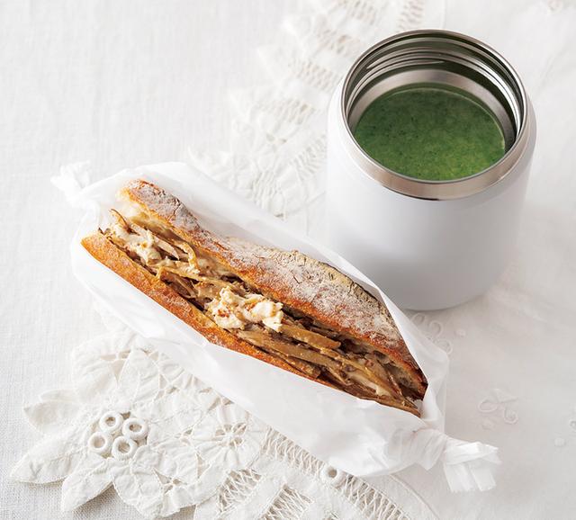 週の半ばは気分を変えて、サンドイッチとポタージュで。ゆでささ身が大活躍のランチです。