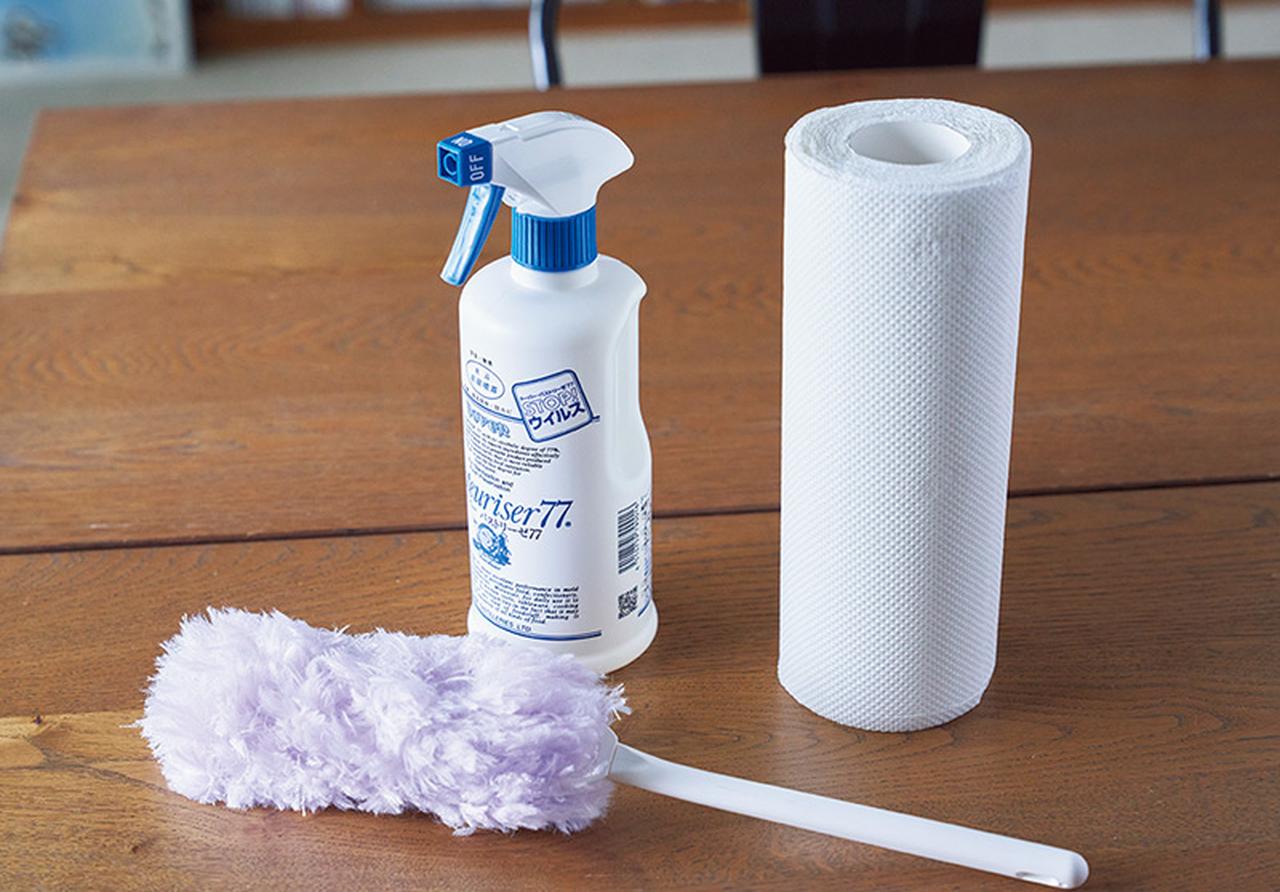 整理収納アドバイザーの岡本あつみさんの家の“きれい”を保つ秘訣は、シンプルな掃除道具にありました。アルコール+キッチンペーパーで家中あちこちを掃除。トレーを使った楽ちん掃除のコツも教えていただきました。